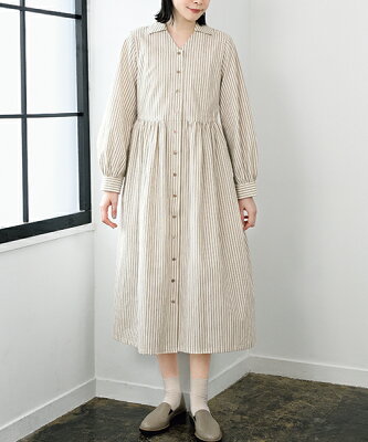 ギャザー切り替えが可愛い長袖のシャツワンピースは、 顔まわりをすっきり見せてくれるVネックラインがポイント。